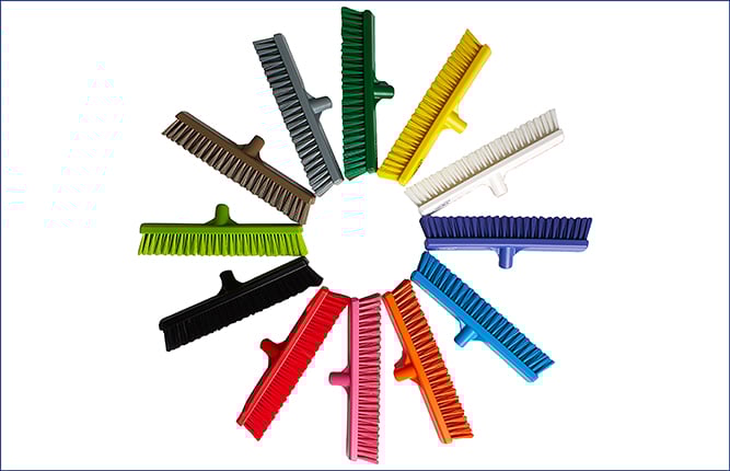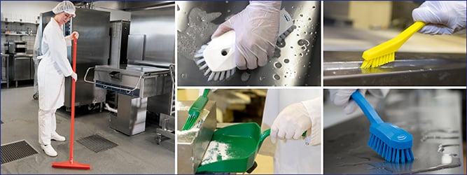 Med färger som är tydligt synliga i förhållande till omgivningen, blir det lättare för dina anställda att upptäcka plastdelar eller borststrån i livsmedlet. Självklart bör du också inspektera rengöringsutrustningen och hanteringsredskapen regelbundet, och byta ut dem så fort de börjar visa tecken på slitage.